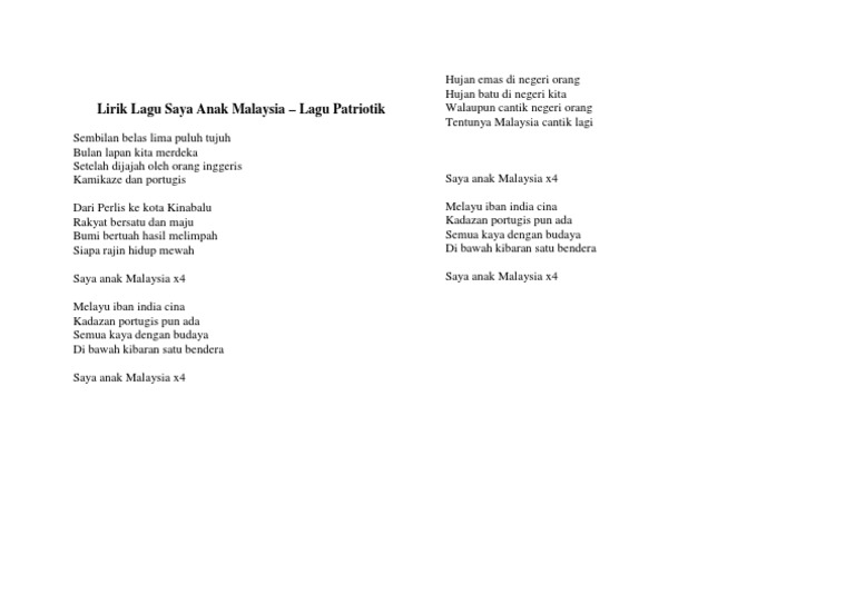 Related : Lirik Lagu Saya Anak Malaysia - .mewah saya anak malaysia x4 melayu iban india cina kadazan portugis pun ada semua kaya dengan budaya di bawah kibaran satu bendera saya anak malaysia x4 hujan emas di negeri orang hujan batu..
